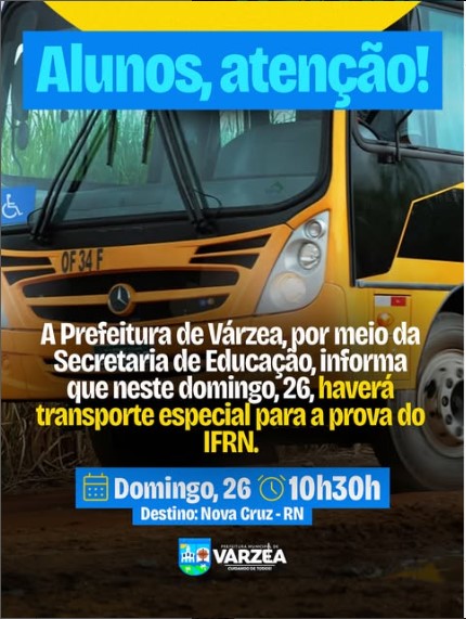 A Prefeitura de Várzea, por meio da Secretaria de Educação, informa que neste domingo, 26, haverá transporte especial para a prova do IFRN.