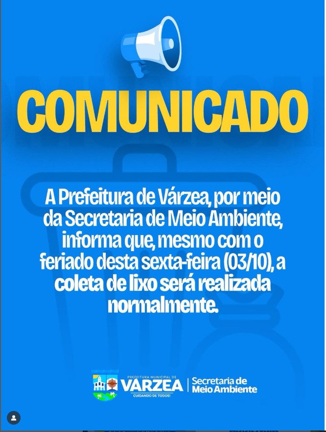 A Prefeitura de Várzea, por meio da Secretaria de Meio Ambiente, informa que, mesmo com o feriado desta sexta-feira (03/10), a coleta de lixo será realizada normalmente.