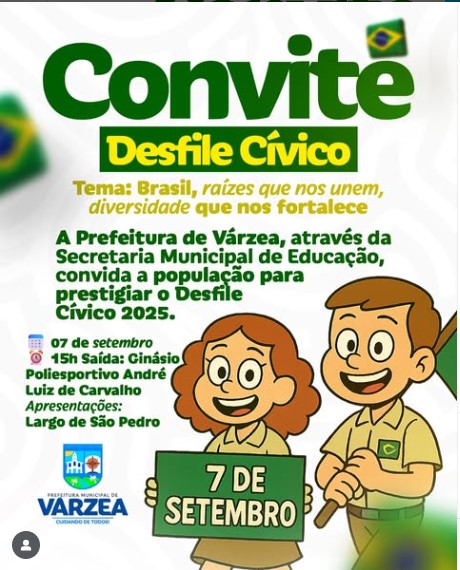 A Prefeitura Municipal de Várzea/RN, por meio da Secretaria Municipal de Educação, tem a honra de convidar toda a população para prestigiar o Desfile Cívico 2025.